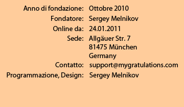 The contents of myGratulations were created with great care. Nonetheless myGratulations don’t take any responsibility for the correctness, completeness or actuality of contents. According to the article § 7 paragraph 1 Telemedia Act of the German public law myGratulations - as a provider of services - is only responsible for his own content. According to § § 8 to 10 Telemedia Act myGratulations is not obligated to verify the information or texts sent by a third party or to control the circumstances that may indicate a violation of the law. myGratulations assume responsibility for contents which are offered on the web page only after a possible violation of the law would be established in written form. In this case myGratulations will delete immediately the respective content.